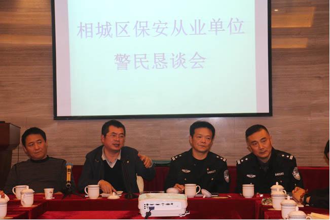 2015年11月19日14:30在江蘇康平保安公司會議室舉行:相城區保安從業單位警民懇談會,與會的有市公安局治安支隊保安監管大隊的朱大、戴大,公安相城分局治安大隊的楊大、賀大、吳警官,還有相城區各保安行業的企業,通過懇談會,深刻領悟市局、分局領導有關指示精神!今年10月—12月省公安廳開展保安市場專項整治活動,公司積極做好:治安信息員、法制宣傳員、義務巡邏隊員工作,爭取完成省公安廳要求2016年6月底前所有在崗保安員必須持證上崗的指示,向兄弟單位學習,不斷完善服務質量,提高公司核心競爭力,走品牌化道路的戰略目標前行!